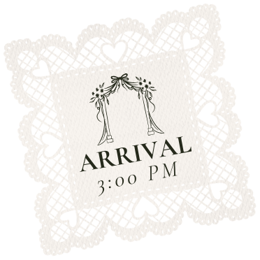 The ceremony starts at 3:30 pm, please arrive by 3:00 pm to be seated. Appetisers and champagne to follow after the ceremony. Reception to start at 6:00 pm until late.